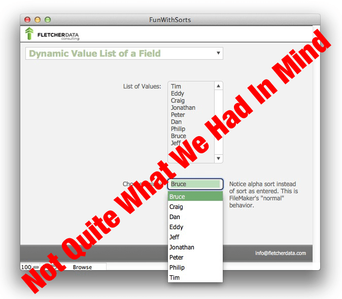 Most FileMaker developers can remember times when they were asked to display a drop-down, pop-up or other dynamic value list in a particular sort order. And we have always had to say, “Naw, you don’t want that. Picker portals are way better!”